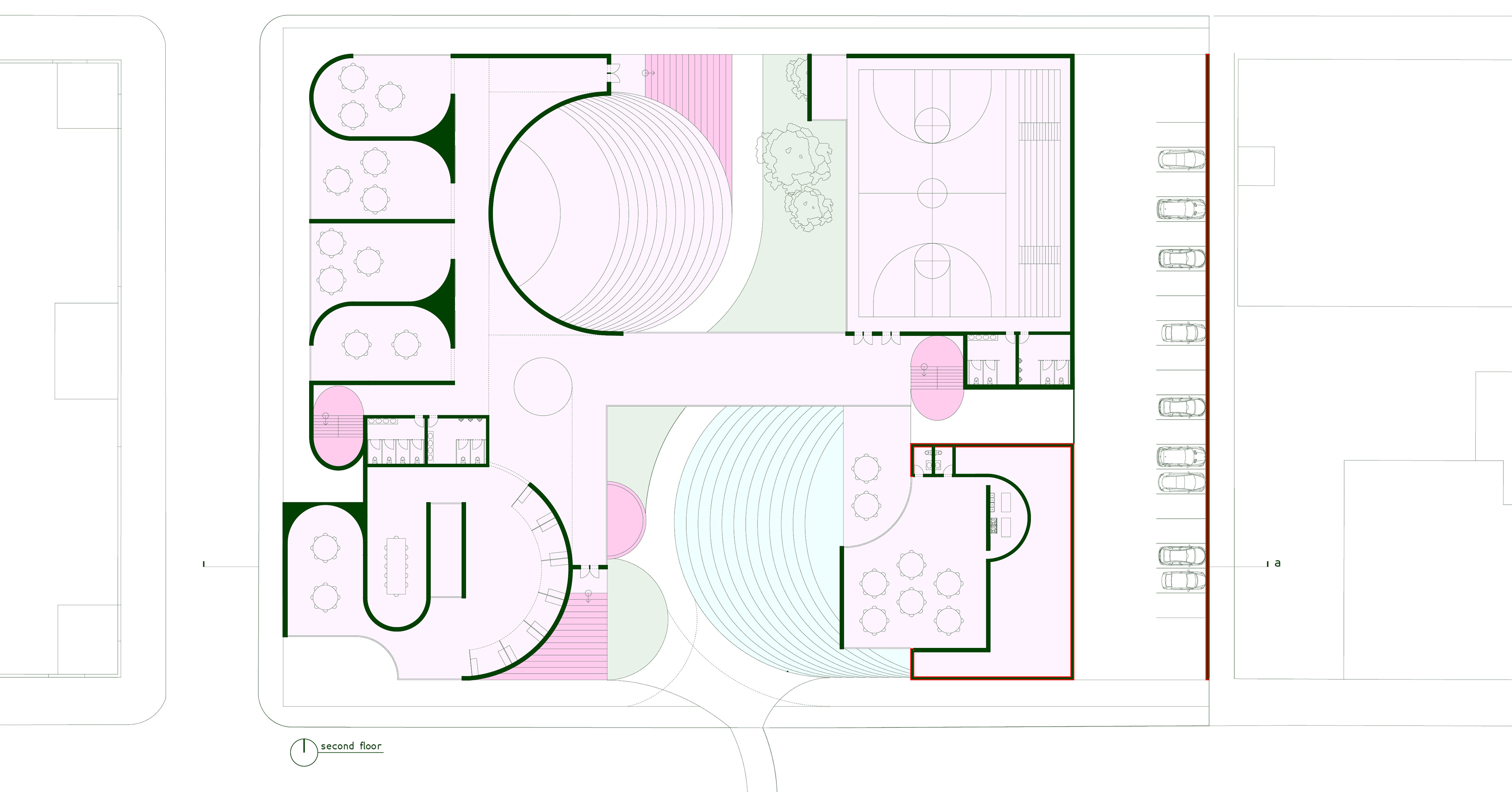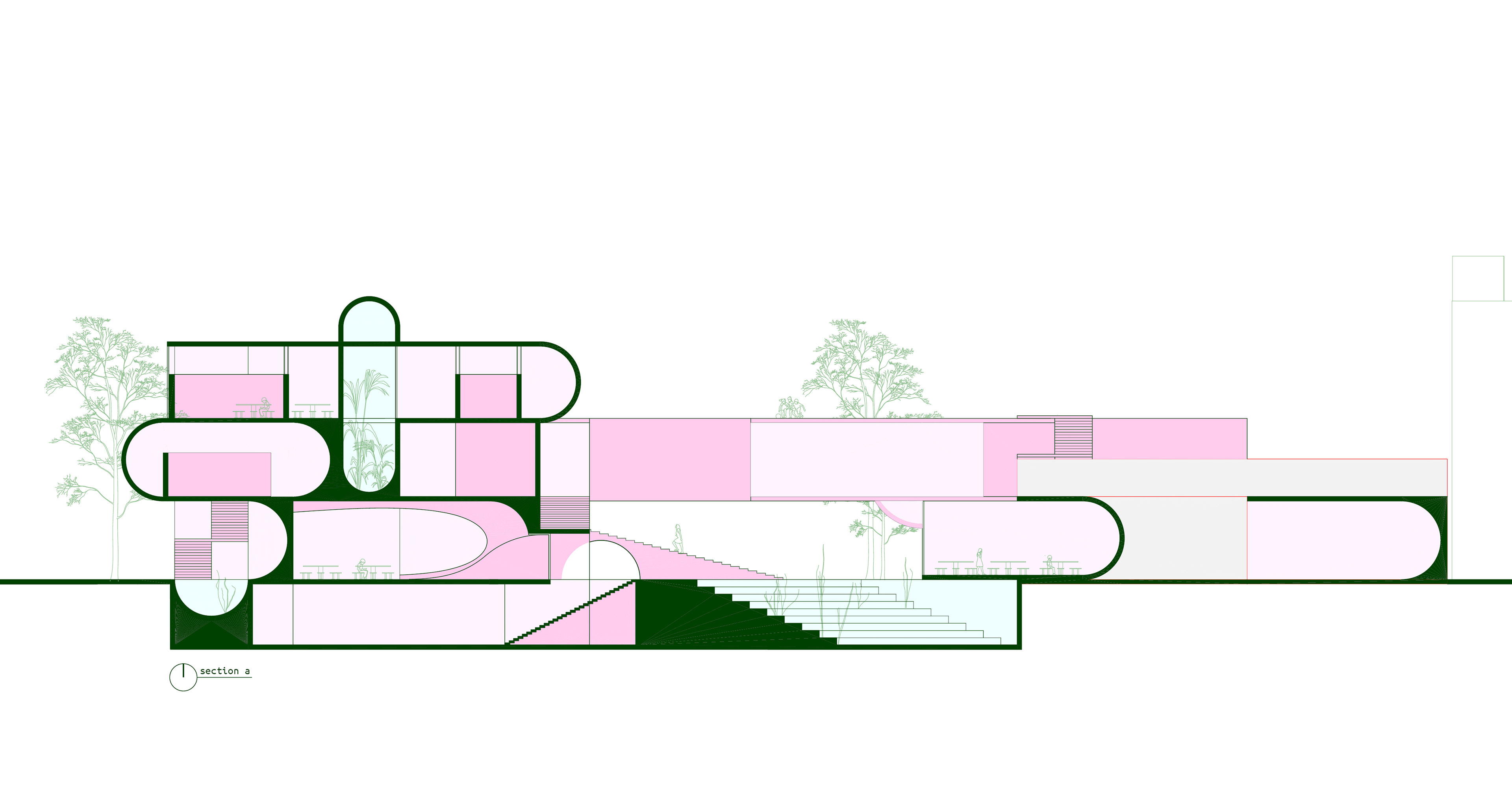 This project reactivates a vacant lot and building in the Brooklyn Red Hook neighborhood into a new learning environment. Rather than viewing the built environment and nature as separate entities, this project strives to restore harmony between them while addressing the challenges posed by the current climate crisis, specifically the impacts of rising sea levels. Unlike conventional floodwater management systems, the project takes a unique approach by inviting water into the fabric of the building. By incorporating water into the building’s design, the project seeks to raise awareness and educate its users on the tangible impacts of the global climate crisis. The formal language was developed through a series of 2d and 3d formal explorations, resulting in spatial qualities that serve the dual purpose of operating as a school and community space.
